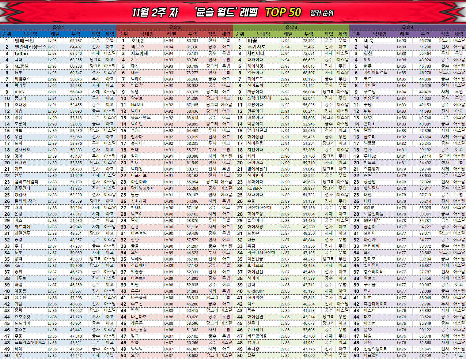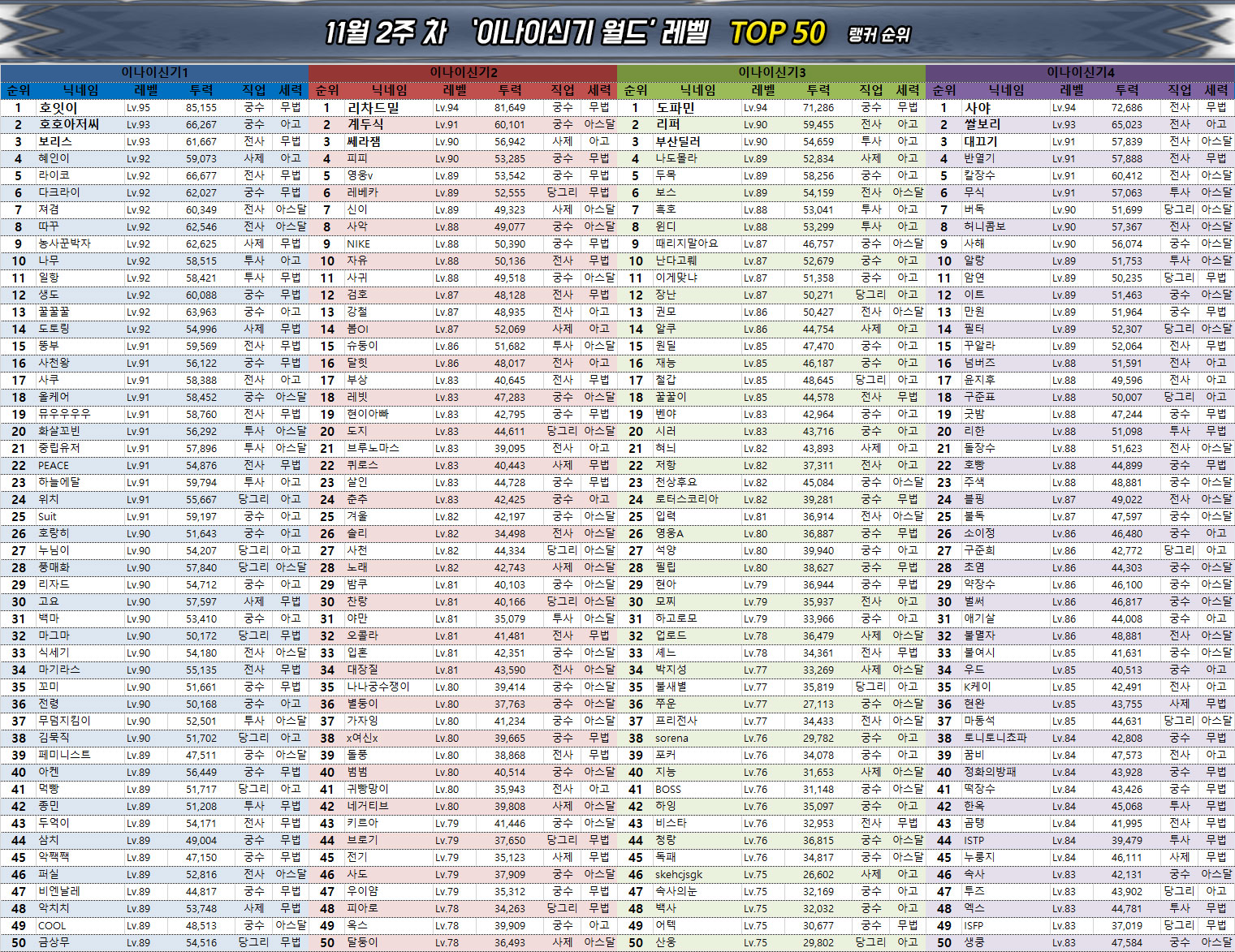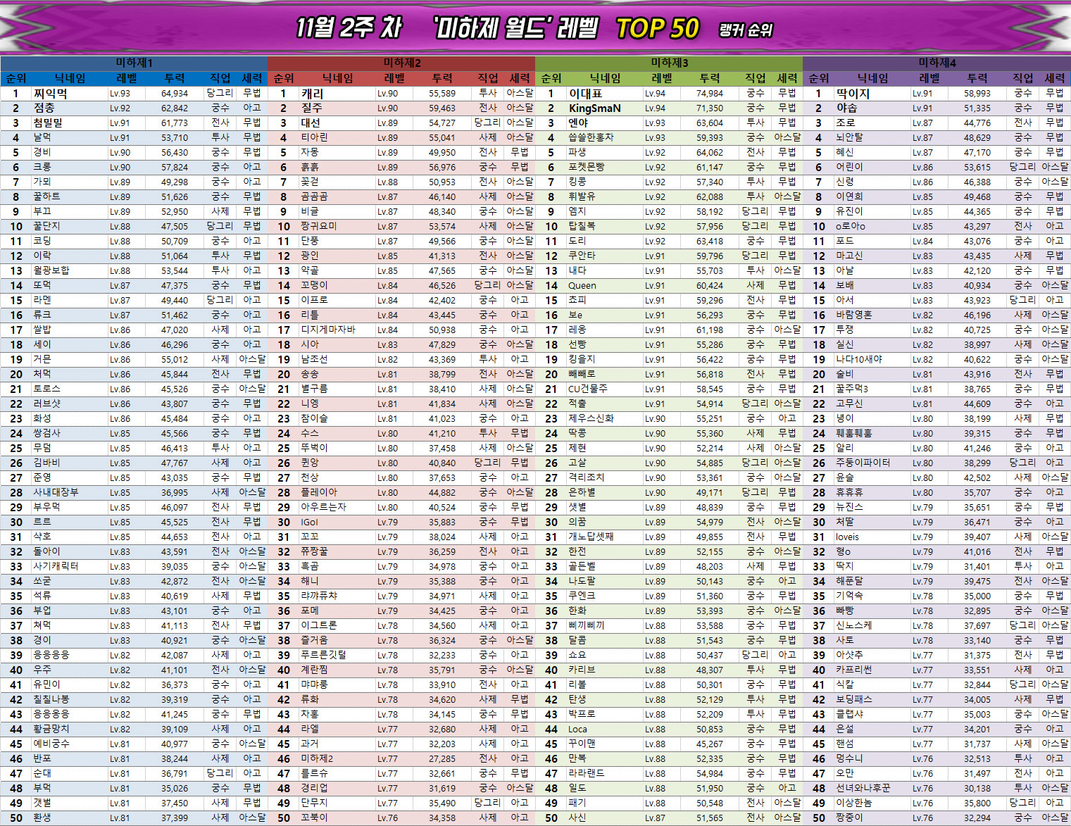 그나마 하위권에서는 다라부루 월드의 오은성 유저가 처음으로 랭킹에 진입한 것이 관측됐다. 전투력 6만을 목전에 두고 있는 일부 약소 서버의 랭커들에게는 최근 업데이트가 큰 영향을 주고 있지는 않는 것으로 보이나 천장을 뚫는데 한계를 느끼는 중위권 이용자들을 위해 대체할만한 콘텐츠를 내놓거나 검은밤 군도의 개선이 시급해보이는 상황이다.
