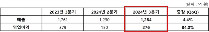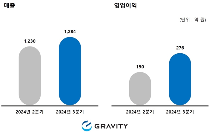 그라비티의 2024년 3분기 매출은 약 1,284억 원, 영업이익은 약 276억 원으로 전년 동분기 대비 매출과 영업이익은 감소했지만 전분기 대비 매출과 영업이익이 각각 4.4%, 84.0% 증가하며 상승세를 보였다. 지난 10월 31일, 동남아시아 지역에 ‘The Ragnarok’, 대만∙홍콩∙마카오 지역에 ‘라그나로크: 리버스’를 각각 론칭해 초반 흥행을 거두고 있는 만큼 4분기에도 실적 상승을 이어 나갈 수 있을 것으로 기대한다.