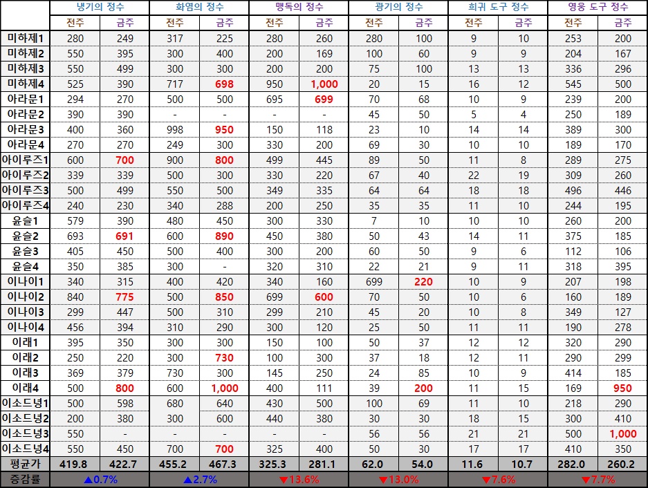 하지만 대도시 서버를 제외하면 정수류 아이템에서 대부분 최소 하나 이상의 품목이 서버 내에서 유통망이 아예 소실되거나, 특정 유저 한명이 비정상적인 가격으로 이를 쥐락펴락하고 있는 것이 관측됐으며 그 가격대가 적게는 평균가의 2배에서 심하면 4배를 상회하는 것으로 나타났다.