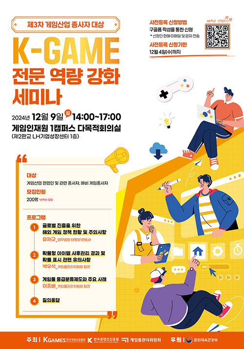 [자료제공 = 한국게임산업협회] 한국게임산업협회(협회장 강신철, K-GAMES)는 오는 12월 9일(월) 오후 2시 판교 게임인재원 1캠퍼스 다목적회의실(제2판교 LH기업성장센터 1층)에서 ‘제3차 게임산업 종사자 대상 K-GAME 전문 역량 강화 세미나’를 개최한다.