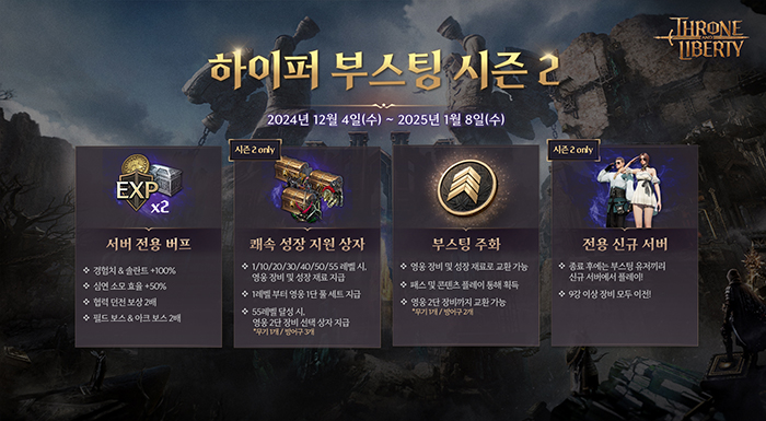 엔씨(NC)는 서비스 1주년을 기념해 ‘하이퍼 부스팅 시즌2’ 서버를 2024년 12월 4일부터 연다. 이용자는 새로운 서버에서 캐릭터를 빠르게 성장시킬 수 있다. ‘하이퍼 부스팅 시즌2’는 이벤트 종료 후에도 기존 서버와 통합되지 않고 독립적으로 운영된다. 착용한 장비와 아티팩트, 9강 이상의 영웅 장비 등을 그대로 사용할 수 있다.