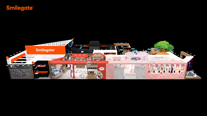 일산 킨텍스 2홀 출입구 앞에 위치할 예정인 스마일게이트 부스는 스마일게이트의 상징색인 오렌지색을 활용하고 부스를 구성하는 4개 IP의 특징을 반영해 디자인됐다.