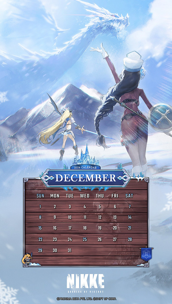 한편, 니케는 같은 날 'ICE DRAGON SAGA' 화보의 12월 달력을 공개했습니다. 조금 더 확대된 둘의 뒷모습을 볼 수 있는데 '길로틴'과 '메이든'의 의상이 한결 더 과감하다는 걸 알 수 있네요.