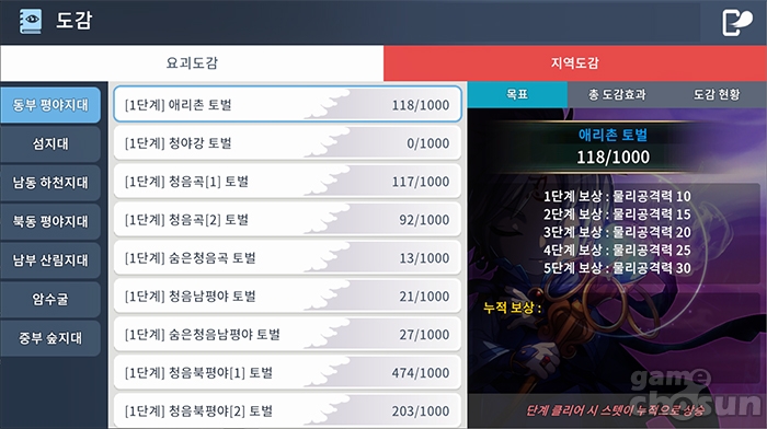 예를 들어 초반 지역 중 하나인 '애리촌'을 보자면 '애리촌 토벌'은 1단계 물리 공격력 10 상승에서 5단계 물리 공격력 30까지 상승하고, '청음북평야(2) 토벌'은 매 단계별로 활력이 1씩 상승합니다. 즉, 이런 식으로 자신의 직업에 맞는 스탯 보너스를 주는 지역부터 찾는 것이 중요하겠습니다.