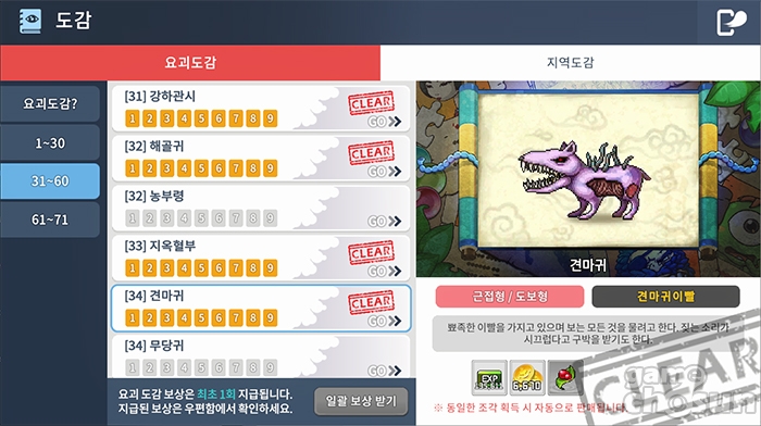 덧붙여 같은 도감 메뉴에 있는 '요괴도감'에서는 각 몬스터 별로 퍼즐을 모아 추가적인 보상을 얻는 것이 가능합니다.
