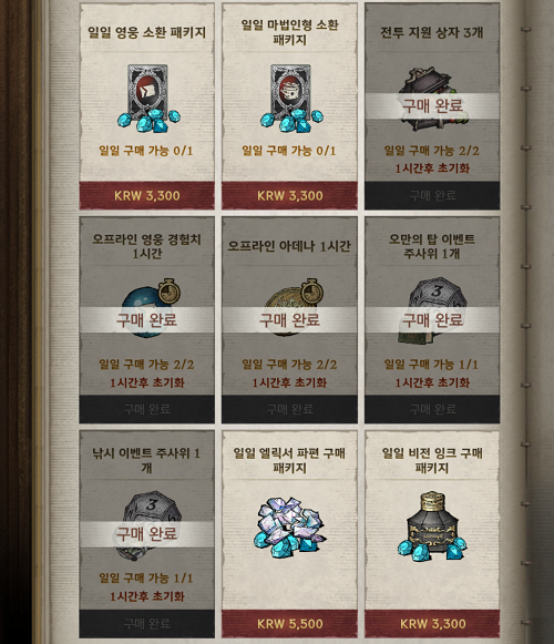 일일 상점에서는 광고 시청 시 무료로 구매할 수 있는 아이템을 판매하고 있다. 모든 광고 시청 시 주사위 30개, 지휘 스킬 소환권 10개, 전투 지원 상자 6개, 오프라인 영웅 경험치 2시간, 오프라인 아데나 2시간, 오만의 탑 이벤트 주사위 1개, 낚시 이벤트 주사위 1개 등을 제공받을 수 있다.