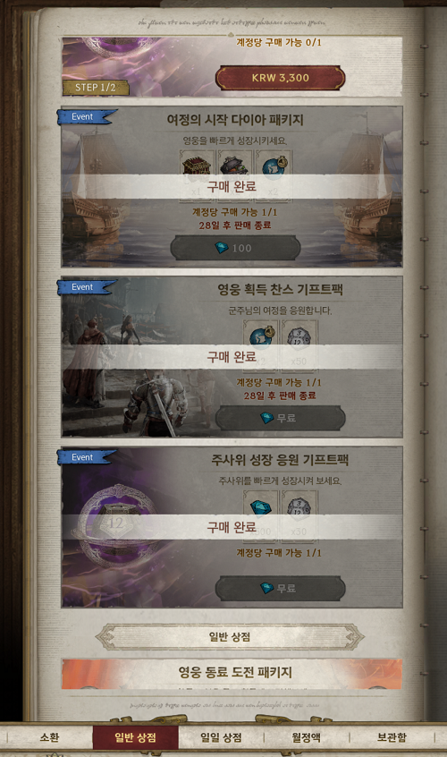 광고 시청 리워드 외에도 정식 출시를 기념해 일반 상점에서는 무료, 혹은 저렴한 다이아 상품을 판매하고 있다. '여정의 시작 다이아 패키지'는 100 다이아에 구입할 수 있으며, 영웅 도전 상자 및 전투 지원 상자, 영웅 경험치 등이 상품 내에 포함돼 있다.