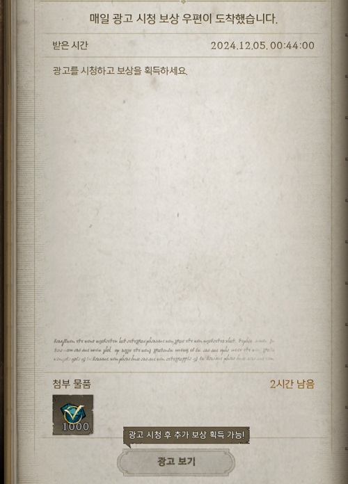 매일 우편을 통해 광고 시청 보상이 제공되는데, 해당 리워드를 통해 1,000 다이아를 획득할 수 있다.
