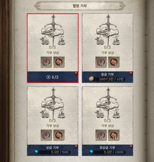 혈맹 기부는 일반, 중급, 상급, 최상급 등 총 4종으로 나뉘어져 있는데, 이중 일반 기부의 경우에는 매일 3회 광고 시청 시 기부가 이뤄지고 혈맹 상점 주화 및 혈맹 경험치를 보상으로 제공받는 것이 가능하다.