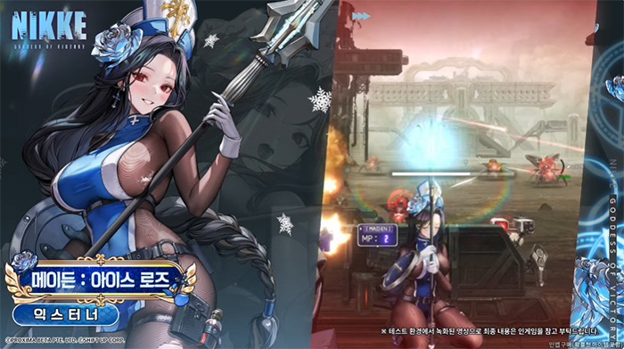 '메이든 : 아이스 로즈'는 '3버스트', '방어형'에 '로켓 런처(RL)'를 사용하는 '전격' 코드 니케로, 특이하게도 방어형이면서도 3버스트 요원으로 나왔습니다.