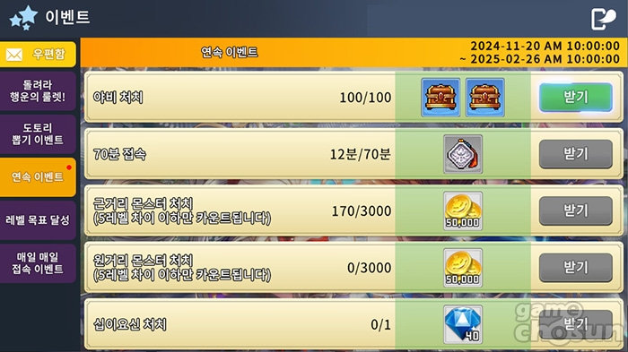 '연속 이벤트'는 11월 20일부터 2월 26일까지 진행 중인 이벤트로, 미션 달성을 할 때마다 계속해서 연속으로 보상을 얻을 수 있는 이벤트입니다.