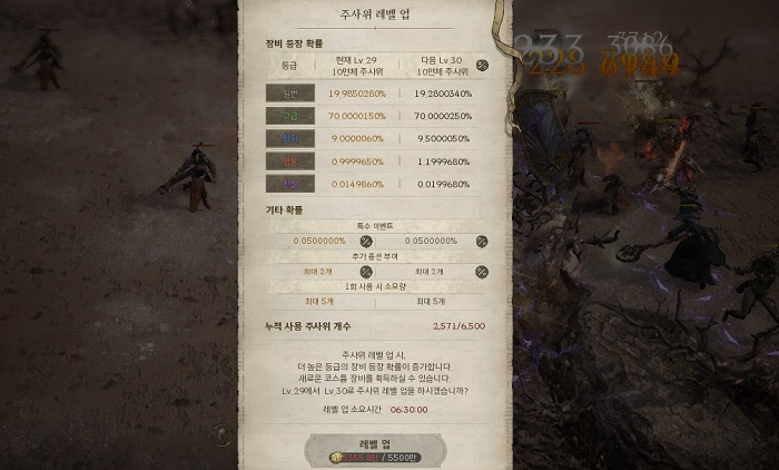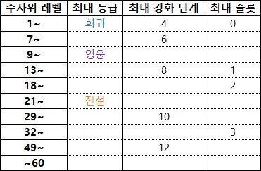 주사위의 기본 개념부터 살펴보자. 주사위는 일정 횟수 이상 사용 시, 레벨업이 가능하며 레벨이 증가할수록 주사위에서 등장하는 장비의 최대 등급 및 등장 확률, 인챈트 단계도 상승한다. 이외에도 장비에 부여되는 추가 옵션의 개수가 증가한다.