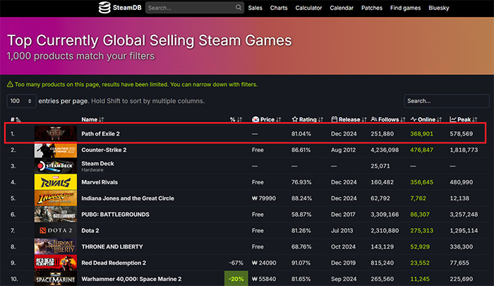 출시 전부터 100만 명 이상의 얼리 액세스 팩 구매가 이어졌으며, 스팀 글로벌 평가 또한 ‘매우 긍정적(12/11 기준)’을 기록하고 있다. 또 스팀 글로벌 매출 1위를 유지하는 등 전 세계가 ‘패스 오브 엑자일 2’에 주목하고 있다.