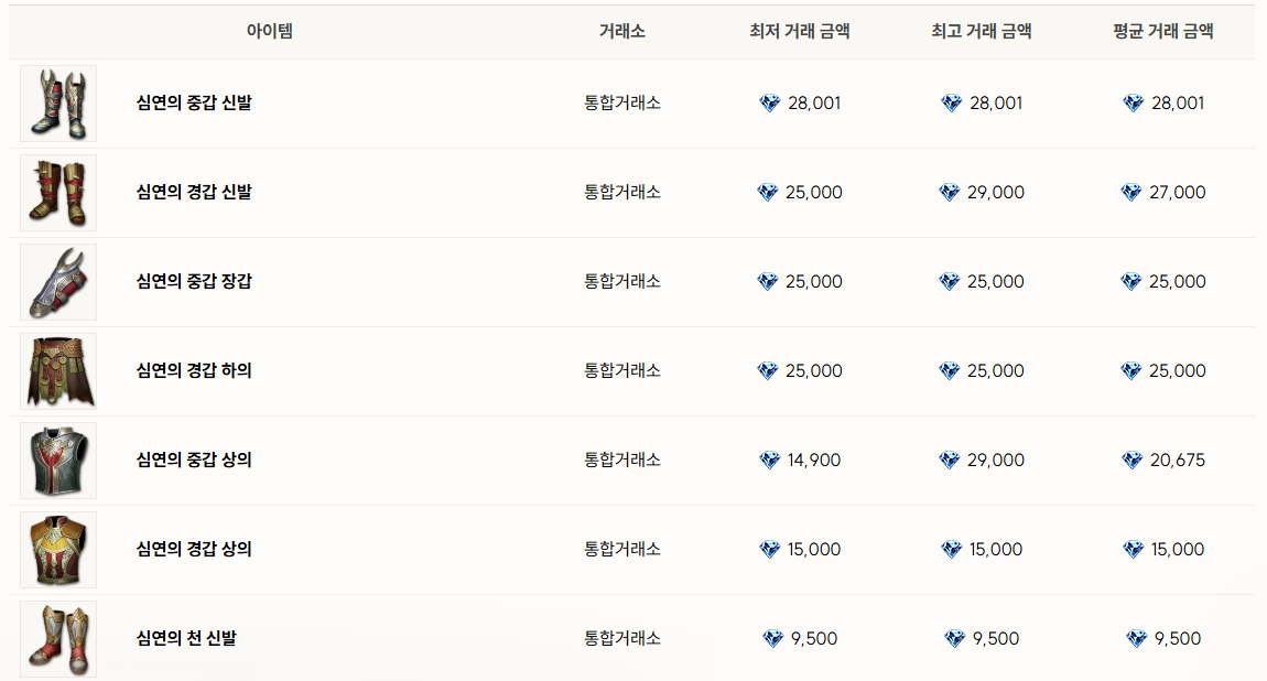 현시점에서 클래스 점유율 투톱을 달리고 있는 궁수, 쌍검사의 공용 장비인 경갑은 아예 매물 자체가 보이지 않을 정도로 거래소에 올라오는 족족 사라지는 진풍경을 보여주고 있으며, 그나마 중갑과 천은 간간히 유통되고 있음을 확인할 수 있다.