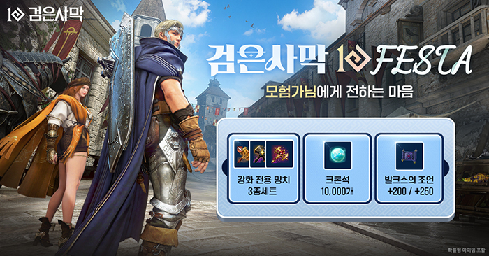 ‘검은사막’은 2014년 12월 17일 서비스를 시작해 올해 10주년을 맞았다. 10주년을 기념해 전 세계 모험가를 대상으로 스페셜 접속 보상 이벤트를 2월 26일까지 진행한다. 모험가는 게임에 접속일에 따라 꿈을 부르는 향로, 발크스의 조언(+190), [이벤트] 희미한 어둠 포식의 기원, 의상 선택 상자(총 4종) 등을 받을 수 있다. 마지막 21일 차 접속 보상으로 J의 우직한 망치도 획득할 수 있다.