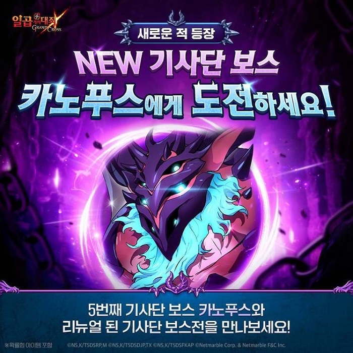 기사단 보스전의 시즌 다섯 번째 마수 '카노푸스'도 새로이 모습을 드러내며, 기사단 보스전 콘텐츠의 리뉴얼도 이뤄진다. 카노푸스는 2월 15일까지 기사단 보스전을 통해 만나볼 수 있으며 기존 공개된 4개의 기사단 보스전 또한 선택해 입장이 가능하다. 마수 카노푸스의 헬 난이도 기본 클리어 스코어는 2,000점으로 적용된다.