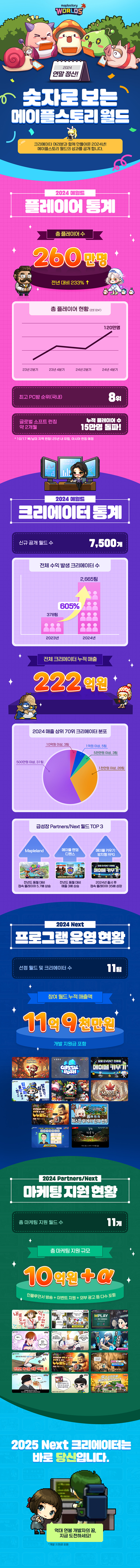 이번 인포그래픽은 지난 해 1월 1일부터 12월 31일까지의 데이터를 기반으로 플랫폼과 크리에이터의 눈부신 성장, 매출, 그리고 크리에이터 지원 프로그램의 결과를 한눈에 담아내며, 크리에이터와 플레이어, 그리고 ‘메이플스토리 월드’가 함께 일궈낸 공동체로서의 성과를 조명한다.