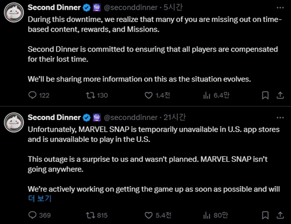 마블 스냅의 개발사인 세컨드 디너 측에서는 공식 X(트위터)와 디스코드를 통해 서비스가 중단된 기간 동안 플레이타임 기반 콘텐츠와 미션의 수행, 보상 획득이 불가한 점을 인지하여 이에 대한 보상책을 마련하기 위해 최선을 다할 것이라고 밝혔으며 서비스 재개를 위해 노력 중이라고도 덧붙였다.