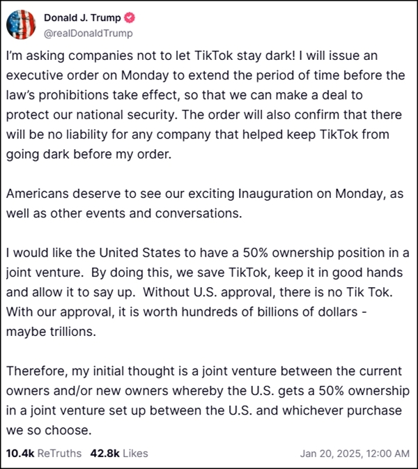 한편, 미국의 47대 대통령 당선인 '도널드 트럼프'가 취임함에 따라 생각보다 빠르게 본 사태가 소강될 가능성도 점쳐지고 있다. 트럼프 당선인이 본인의 트루스소셜 스레드에서 월요일 중으로 틱톡 금지법의 시행을 유예하고 미국 사업권 매각 기간을 연장하겠다고 발표함에 따라 20일을 기준으로 이미 틱톡의 서비스는 재개된 상태다.