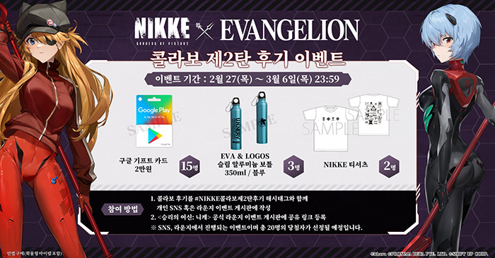 콜라보 제2탄을 기념에 후기 이벤트도 진행 중이다. 2월 27일부터 3월 6일까지 #NIKKE콜라보제2탄후기 해시태그와 함께 개인 SNS 혹은 라운지 이벤트 게시판에 작성하고, 공식 라운지 이벤트 게시판에 공유 링크를 등록하면 참여할 수 있다. 참가자 중 총 20명의 당첨자를 선정해 '구글 기프트 카드 2만원권', 'EVA & LOGOS 슬림 알루미늄 보틀 350ml / 블루', 'NIKKE 티셔츠'를 증정할 예정이다.