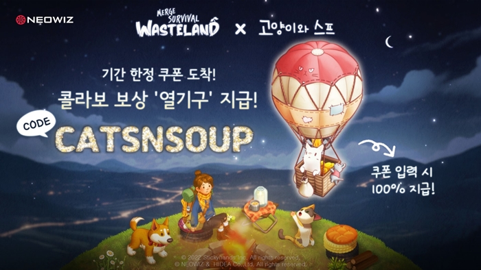 강아지 캐릭터 ‘시드’의 집 외형을 꾸밀 수 있는 ‘열기구를 탄 키키’ 쿠폰 이벤트도 진행한다. 인게임 내 쿠폰 페이지에 접속한 뒤 쿠폰 코드(CATSNSOUP)를 입력하면 보상을 획득할 수 있으며, 해당 쿠폰은 3월 한 달간 이용할 수 있다.