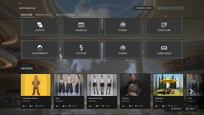 인조이의 모딩 기능(모드킷, Modkit)은 인조이에 탑재돼 있는 모드 호스팅 플랫폼 '커스포지(Curseforge)'를 통해 업로드가 가능하며, 인조이 게임 내 탑재돼 있는 '모드 브라우저'를 통해 간편하게 설치 후 사용 가능하다. 아울러 제작한 모드를 로컬 파일로 저장한 뒤 설치 경로 상에 복사 후에 사용하는 방법도 지원한다.