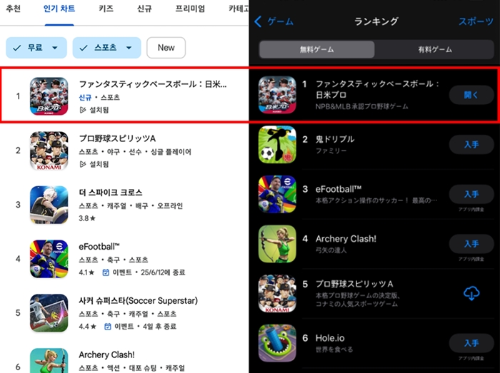 [자료제공 = 위메이드] 위메이드(대표 박관호)가 서비스하고 라운드원스튜디오(대표 이건희)에서 개발한 '판타스틱 베이스볼: 일미프로'가 출시 후 3일 만에 일본 구글 플레이와 애플 앱스토어 스포츠 게임 인기 순위 1위를 달성했다.