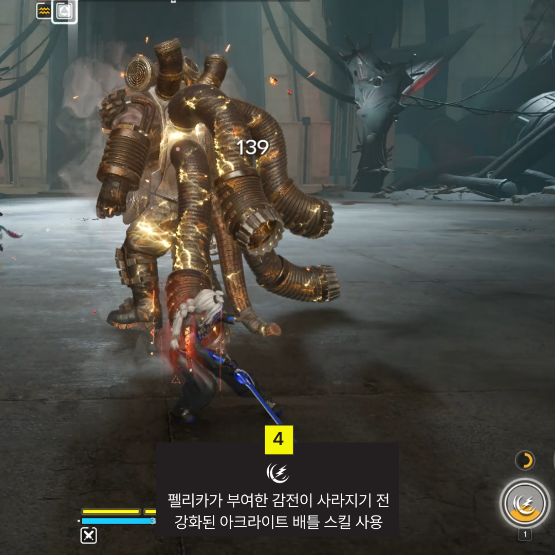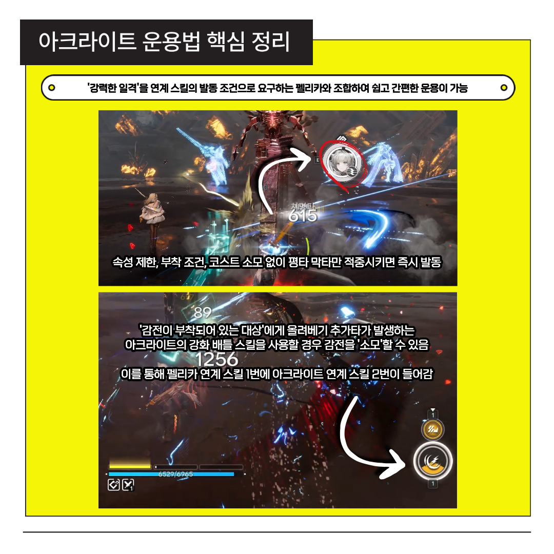그나마 아크라이트의 궁극기는 1타 돌진에서 전기 부착이 발생하는 사양이지만, 2타 뇌격이 해당 전기 부착을 소모하여 감전으로 치환하기 때문에 파티의 사이클이 한번 돌아간 다음 비는 시간에 쓰는 것으로 사이클이 꼬이는 것을 피해갈 수 있으며 펠리카나 아크라이트가 거는 감전은 적에게 모든 종류의 아츠 피해 증가 디버프를 부여하기 때문에 팀적인 기여도 가능합니다.