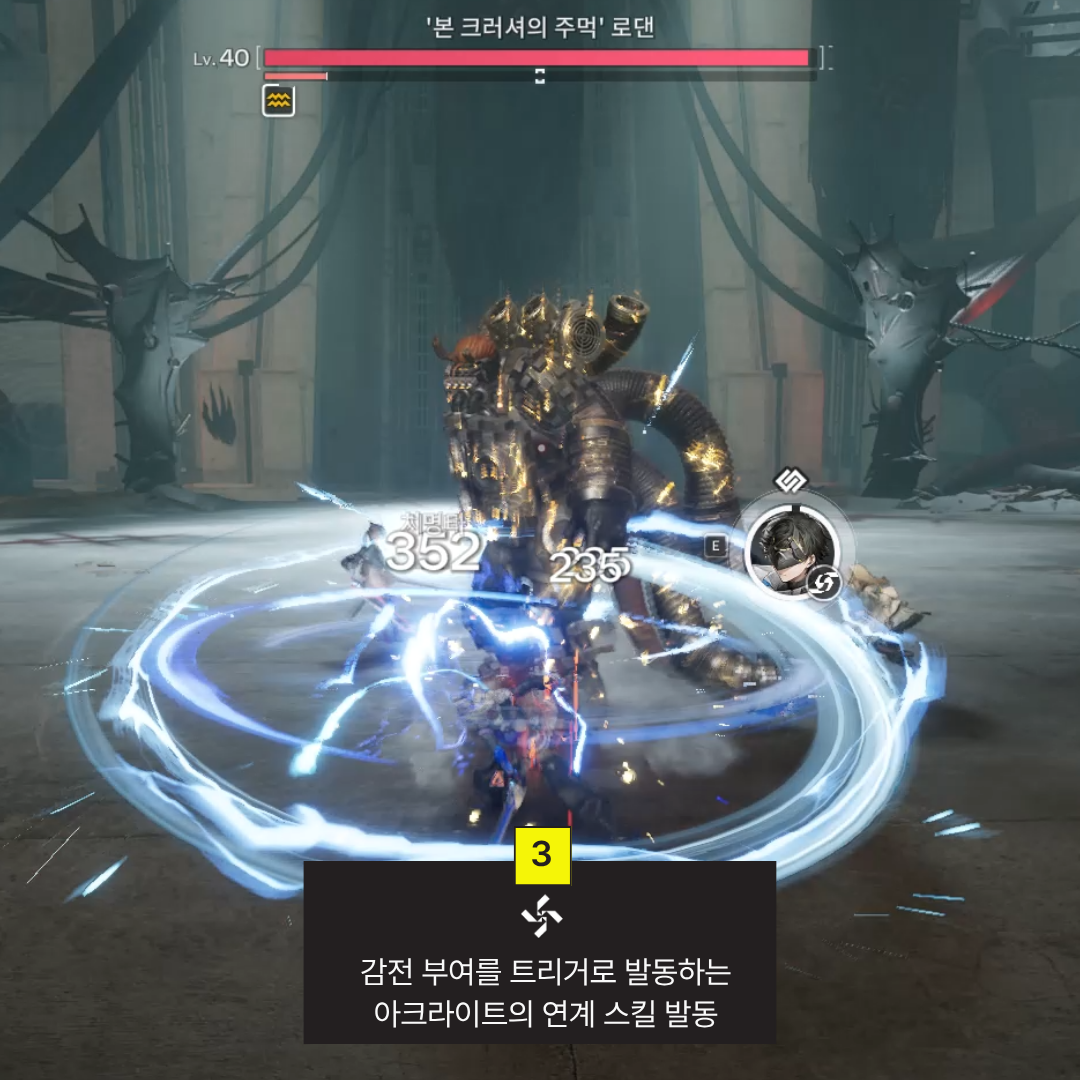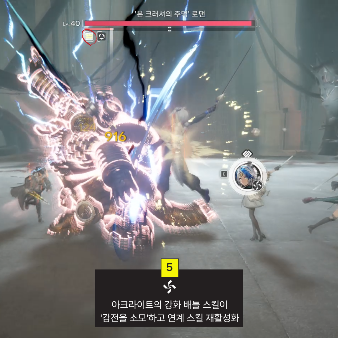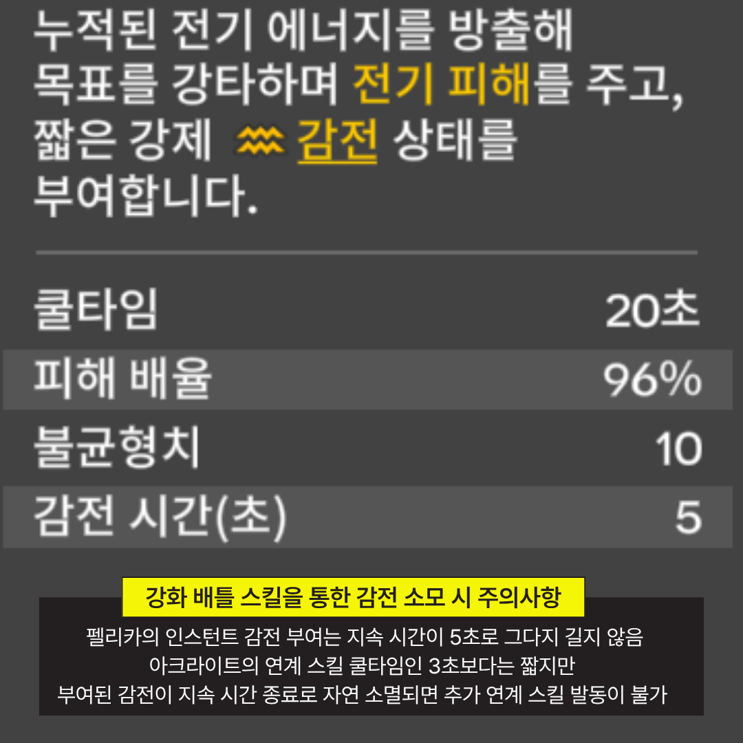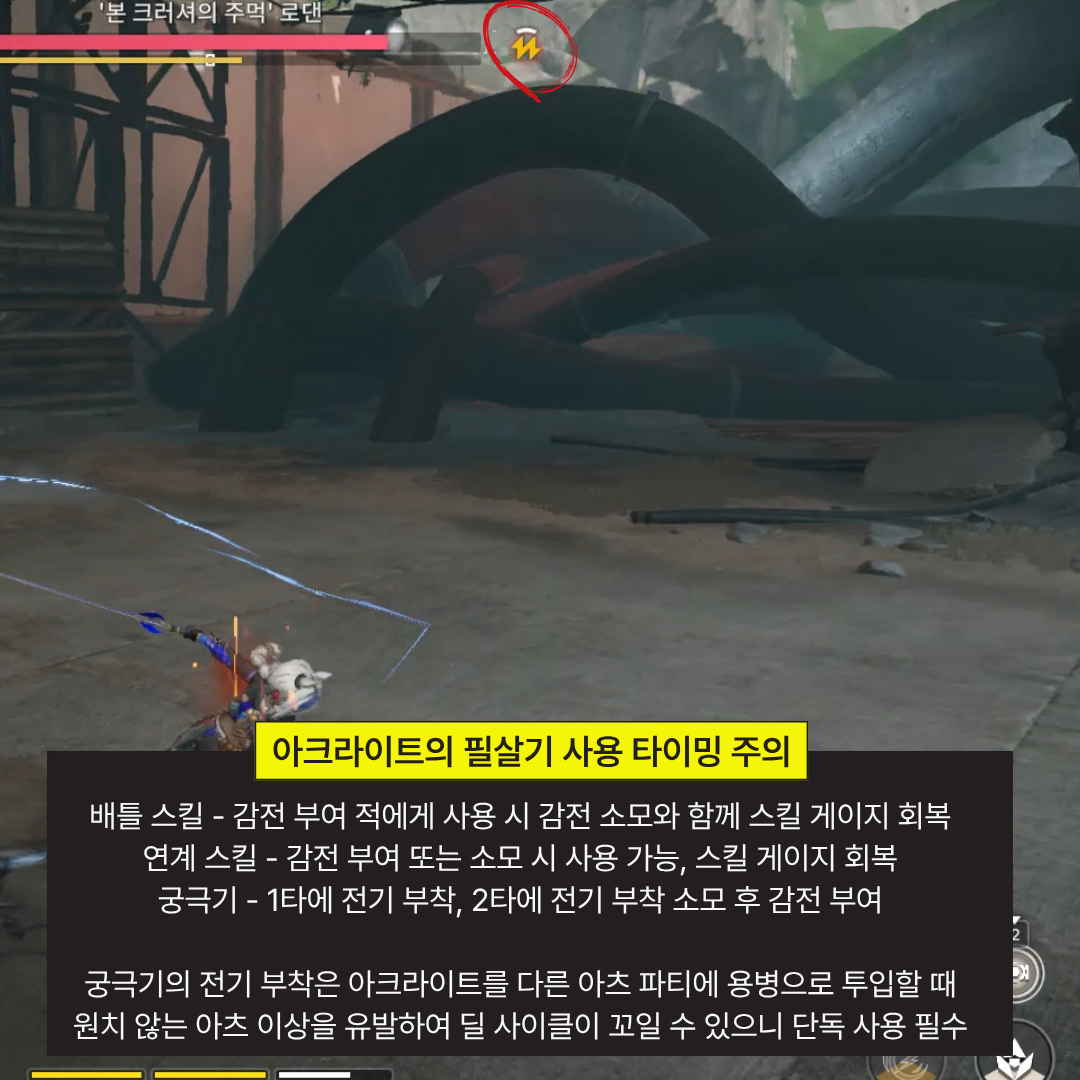 심지어 스킬 게이지가 너무 빠르게 차올라서 남아돈다면 아크라이트는 본인의 배틀 스킬로 이를 소모하여 DPS를 펌핑하는 전략도 취할 수 있습니다. 아크라이트의 배틀 스킬은 적에게 부여된 감전을 소모하여 강화가 가능한데 이것이 감전이 걸리거나 감전을 소모하는 것을 조건으로 요구하는 연계 스킬과도 맞물리기 때문입니다.