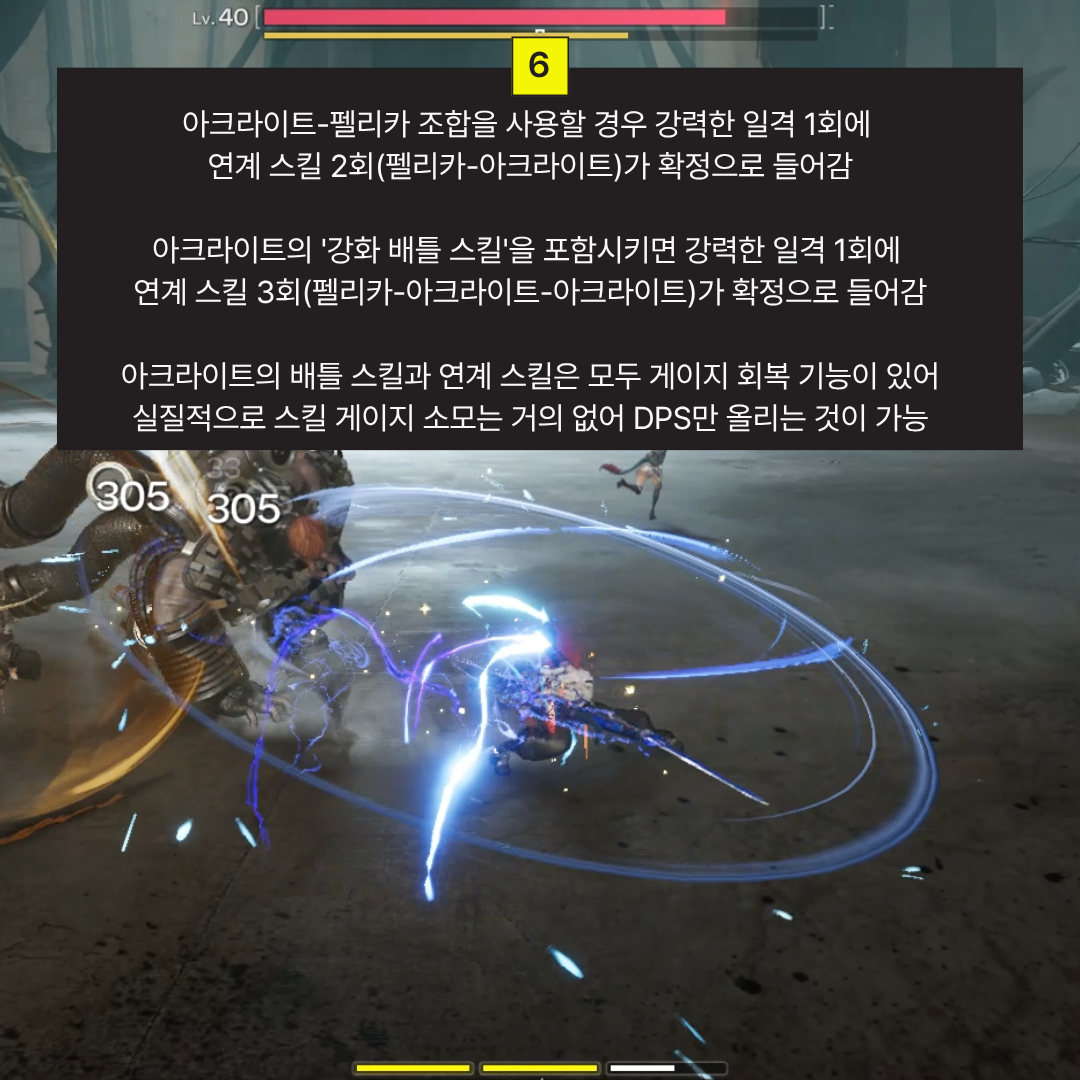 더군다나 아크라이트의 연계 스킬의 기본 쿨타임은 3초로 장히 짧은 편에 속해 펠리카의 연계 스킬로 감전 부여-아크라이트 연계 스킬-아크라이트 배틀 스킬-아크라이트 연계 스킬이라는 기상 천외한 콤보가 가능합니다.