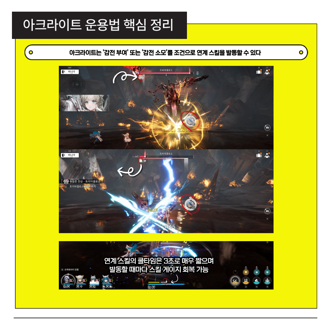 아크라이트의 배틀 스킬과 연계 스킬에 모두 스킬 게이지 회복이 있어 소모값이 부담스럽지 않다는 장점도 있으니 충분히 실전성 있는 전략으로 쓸 수 있다는 점 참고 바랍니다.