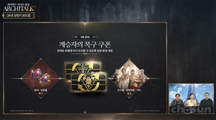 또한, '계승자의 복구 쿠폰'을 모든 유저들에게 지급한다. 복구 쿠폰은 '장비 / 성유물' 복구는 물론 '코스튬 / 팬텀웨폰 / 카드' 복구까지 모두 복구할 수 있도록 풀 세트가 지급된다.