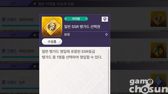 일반 SSR 뱅가드 선택권은 일반 티켓 100개 사용 업적을 달성하면 획득하며, 일반 뱅가드 영입에서 획득 가능한 SSR 뱅가드 9명 중 게이머가 원하는 뱅가드 한 명을 제공한다. 문제는 게임 내에 뱅가드의 정보를 확인할 수 있는 콘텐츠가 없어 어떤 뱅가드가 좋은 뱅가드인지 파악하기 어렵단 것이다.
