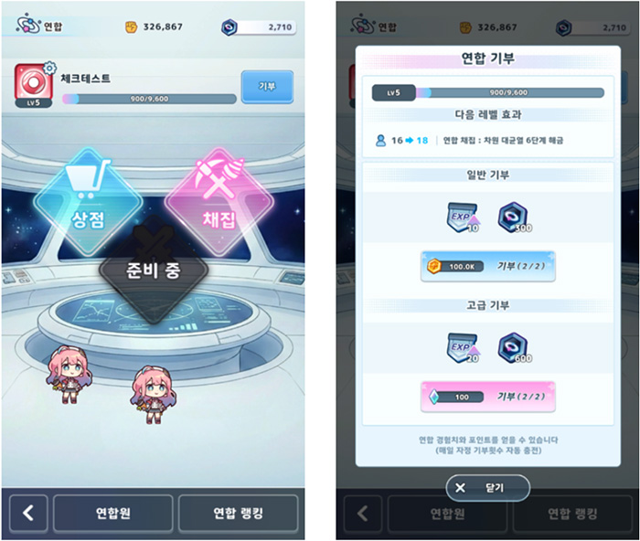 연합원들은 기부 활동을 통해 연합 성장에 기여할 수 있습니다. 일반 기부와 고급 기부 중 선택하여 연합 레벨을 높이는 데 필요한 경험치를 쌓을 수 있으며, 기부에 참여한 개인에게는 전용 재화인 '연합 포인트'가 지급됩니다.