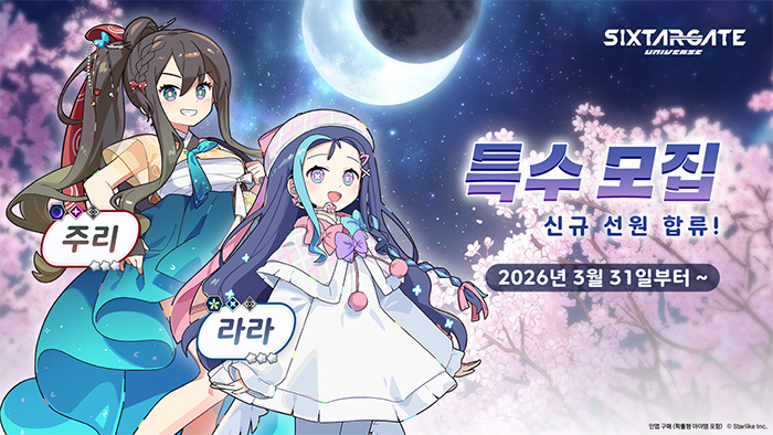 한편, '식스타 게이트: 유니버스'는 4월 1일부로 선원 특수 모집 상시 선원에 메리 에브리의 리더 '라라'와 월하악인의 해금 연주자 '주리'를 추가했습니다. 또, 4월 한달 간 진행되는 출석 이벤트를 새롭게 공개하고, 신규 패키지 및 패스 상품을 선보였습니다.