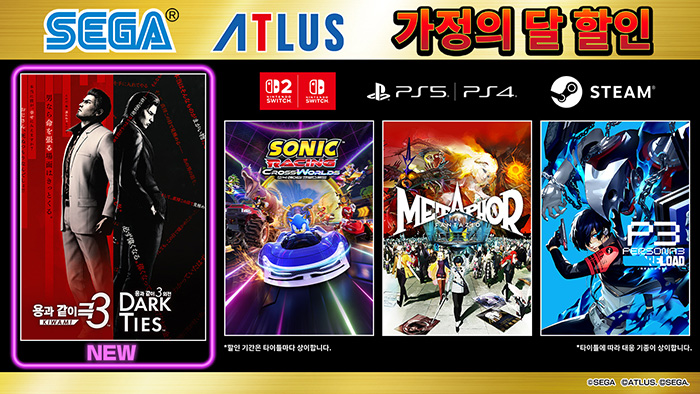 [자료제공 = ] 세가퍼블리싱코리아(대표 사이토 고)는 플레이스테이션 스토어 및 닌텐도 e숍 및 스팀에서 판매 중인 일부 플레이스테이션 5, 플레이스테이션 4, 닌텐도 스위치, 스팀용 타이틀을 기간 한정으로 특별 가격에 판매하는 '세가 황금연휴 맞이 할인'을 개최 중이다.