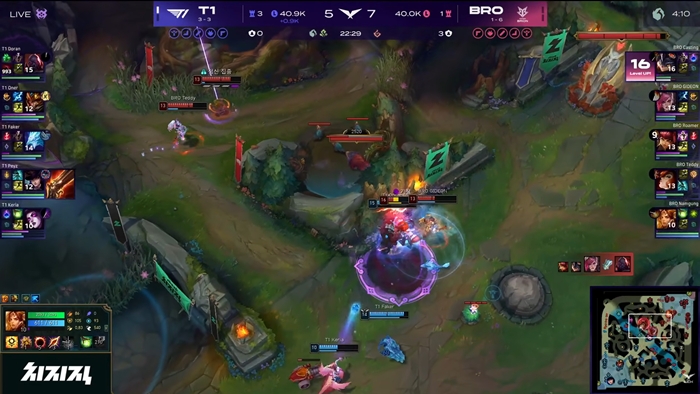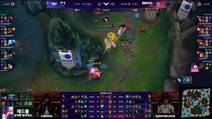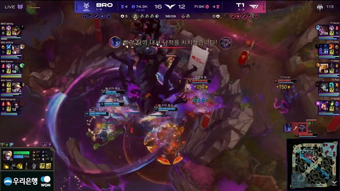 하지만 오히려 아슬아슬한 초반 라인전을 보내던 도란의 오로라가 한타에 돌입하자마자 6만이라는 압도적인 적 대상 피해량 수치를 기록하며 BRO의 본대를 초토화시켜버렸고, BRO는 일찌감치 화학공학 드래곤의 영혼을 완성하고 글로벌 골드를 앞서면서도 끝까지 확실한 교전 승리와 그로 인한 부차적인 이득을 챙기지 못했다.