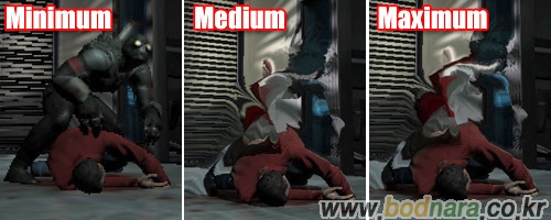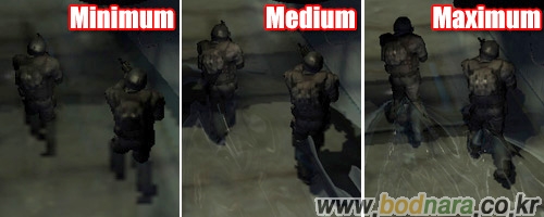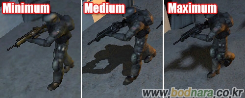 ŸÀÓµ¥¸ð ù Àå¸éÀÎ Ç︮ÄßÅÍ¿¡¼ ´ë¿øµéÀÌ °Ç¹°·Î µé¾î°¡´Â Àå¸éÀº ±×·¡ÇÈ ¿É¼Çº° Â÷À̸¦ Á¤È®È÷ º¸¿©ÁØ´Ù. DirectX 8 ¼¼ÀÌ´õ¿¡ Çȼ¿ ´õºí¸µ ±â¼úÀ» »ç¿ëÇÏ´Â Minimum ¿É¼ÇÀº ¸¶Ä¡ ¿¡¹Ä·¹ÀÌÅÍ·Î µ¹¸®´Â °ÔÀÓÀ» °Á¦·Î Ç®½ºÅ©¸°À¸·Î º¸´Â °Íó·³ ¶³¾îÁö´Â ȸéÀ» º¸¿©ÁØ´Ù. Medium ¿É¼Ç°ú MaximumÀº °ÅÀÇ Â÷À̰¡ ¾ø´Â °Íó·³ º¸ÀÌÁö¸¸, ij¸¯ÅÍ ¾Æ·¡ÀÇ ±×¸²ÀÚ¸¦ º¸¸é MaximumÀº ±×¸²ÀÚ °æ°è°¡ ºÎµå·¯¿îµ¥ ºñÇØ MediumÀº ±×¸²ÀÚÀÇ °æ°è°¡ ¶Ñ·ÇÇÏ°Ô º¸ÀδÙ.