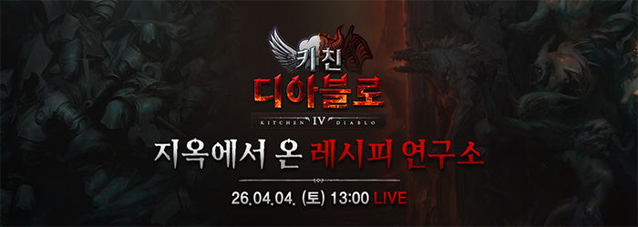 ... 4월 4일 토요일 오후 1시부터 네이버 치지직에서 진행되는 라이브스트림에서는 승우아빠와 마법소년 김셰프(마소킴), 맛수령, 은수저, 잇모어, 쿠코, 한신희 총 7명의 요리 크리에이터가 디아블로 세계관을 주제로 한 테마 요리 개발에 나선다. 시청자들이 최종 메뉴의 이름 선정