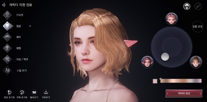 ... 직선 그래프를 이용해 정해진 부위의 정숫값을 변경하는 방법이 아니라 신체 부위를 한 번에 조절할 수 있어 손쉽게 캐릭터를 꾸밀 수 있다. 커스터마이징을 시작하려면 먼저 자신이 플레이할 종족을 선택해야 한다. 종족에는'아쿠아 엘프'와 '판테라'