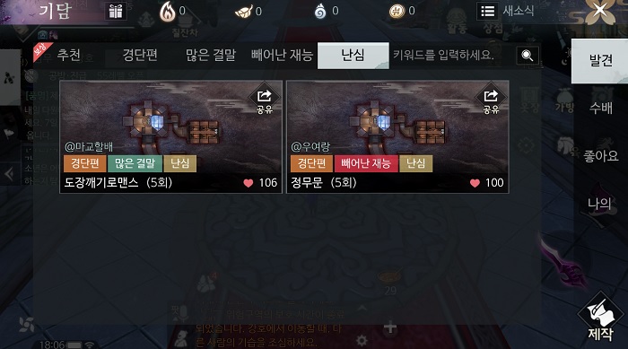 ... 이처럼 직업 콘텐츠는 각 직업의 고유 콘텐츠로 이용자들이 게임이 아니라 무협지 속 삶을 체험하는 듯한 경험을 선사한다. 각 직업이 공통으로 참여할 수 있는 직업 던전은 일반적인 인스턴트 던전의 구성에서 벗어난 진행 방식으로 이용자들에게 새로운 재미를 준다. '격자세계'의