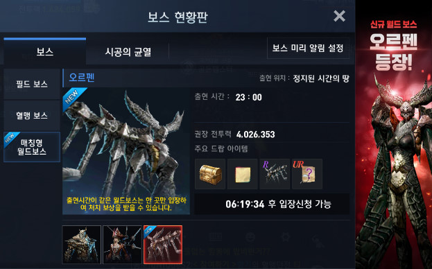 ... 오르펜은 360레벨 이상의 캐릭터만 도전할 수 있는 강력한 보스 몬스터로 오만의 탑 지하 2층 정예던전에서 획득 가능한 악마의 영혼석 또는 스크롤로 제작한 입장권을 사용하여 만날 수 있다. 매일 오후 11시, 정지된 시간의 땅에 위치한 오르펜의 은둔지에서 결전의 징표를 바쳐