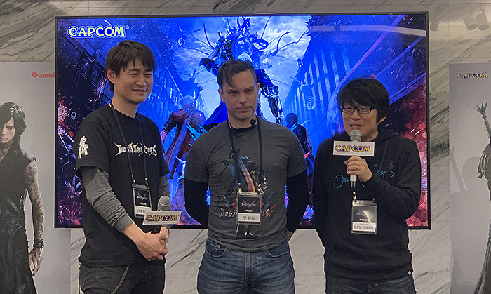 ...먼저 히데아키 디렉터는 ‘데빌메이크라이5’에 대해 “이번 작품은 ‘데빌메이크라이4’ 이후 11년만에 선보이는 정식 넘버링 타이들이다. 레드 그레이브 시티가 무대이며, 마계의 나무가 자라나 사람들을 공격하는 사건을 해결하기 위해 주인공인 네로와 단테 그리고 새롭게 추가된 캐릭터 V