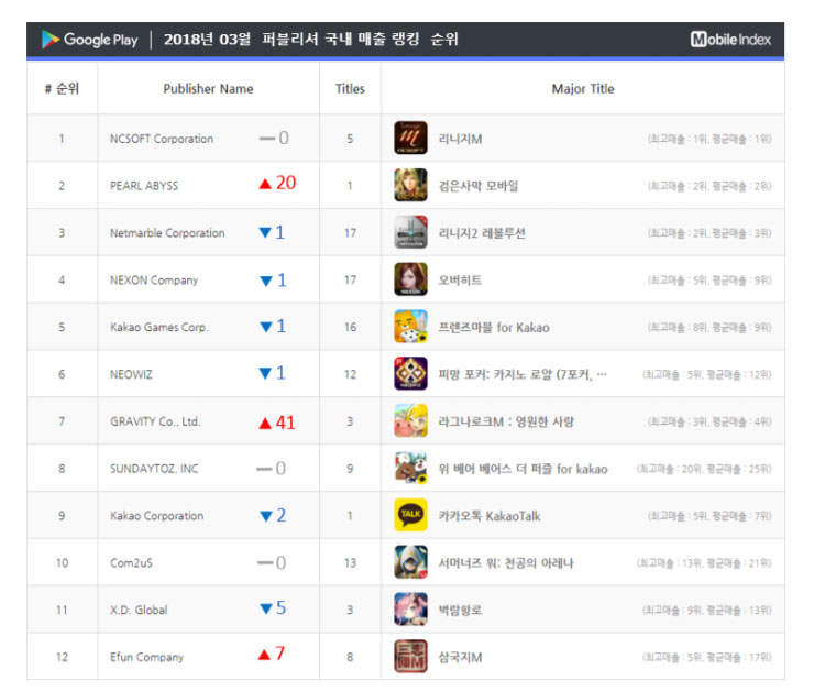 ... 이어 리니지2 레볼루션 외 총 17종을 매출 순위에 올린 리니지2 레볼루션이 3위, 오버히트 및 17종의 넥슨이 4위, 프렌즈마블 및 16종의 카카오게임즈가 5위를 차지했다. 펄어비스의 검은사막 모바일은 리니지M과는 현저한 매출 차이를 보이지만 리니지2 레볼루션이