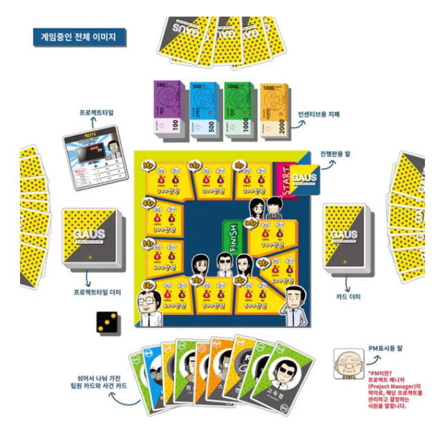 ... 승진을 위해 다양한 프로젝트를 성사시키고 실적을 올려 인센티브를 모아야 하며 이 과정에서 다른 사원과 협력을 하거나 사건카드로 방해할 수도 있다. 즉 계산적인 거래와 절묘한 방해공작 등을 통해 가장 많은 인센티브를 모은 사람이 승리하게 된다. 가우스전자 보드게임을 제작