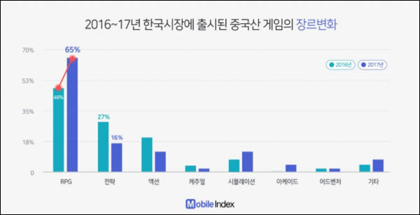 ... RPG 장르는 경쟁이 가장 치열한 시장이지만 한국과 중국 시장 모두 RPG가많이 출시되는 장르이기도 하다. 이는 2018년에도 비슷한 추세가 이어질 것으로 전망된다. 2017년 출시된 중국 게임 가운데 구글플레이 매출 탑20에 진입한 게임은 16개로 연간 총매출