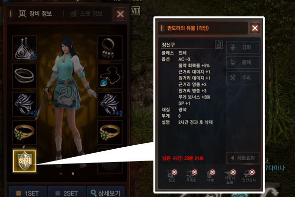 ... ▲ 판도라의 유물 보너스 보상으로 얻는 신규 전설 목걸이 3종 ◆ 판도라의 유물 판도라의 유물주머니는 소모품으로 사용 시 판도라의 유물(각인) 1개를 획득가능하며 이는2시간 동안 룬 슬롯에 장착할 수 있다. 판도라의 유물은 각종 능력치를 올려주는 시간제 장비임과