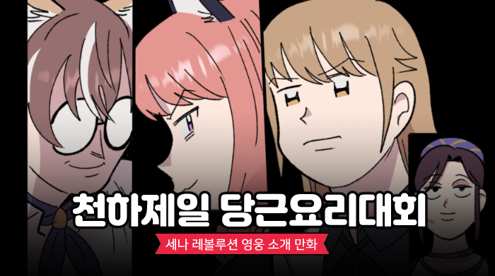 ... 특히 당근 요리에는 재능이 전혀 없는 계승자가 심사위원들을 매료시키는 이야기를 매우 유쾌하게 표현하면서 새로운 즐거움을 제공한다. 세븐나이츠 레볼루션 웹툰 '세나 레볼루션 영웅 소개 만화'는 공식 포럼 세븐나이츠 레볼루션 매거진이나 게임조선에서 확인할