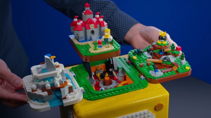 ... 이번 제품은 물음표 상자 안에 '버섯 성'과 '폭탄병의 전쟁터', '추워추워 마운틴', '붉은 용암 랜드' 등 슈퍼 마리오 64등장하는 지역 네 곳을 그대로 재현한 것입니다. 각 지역은 커다란 물음표 블록 안에 담겨