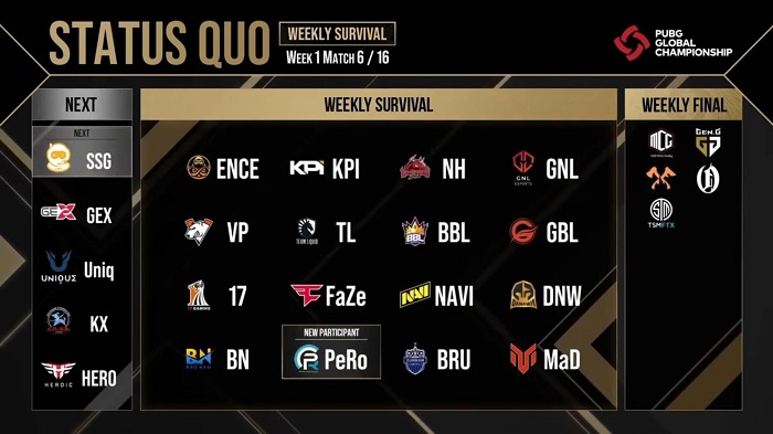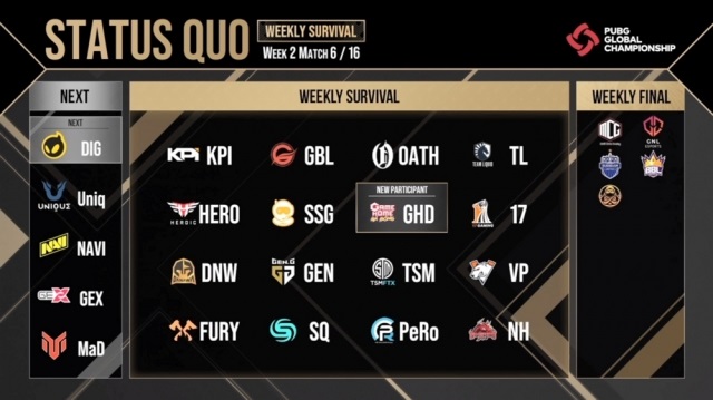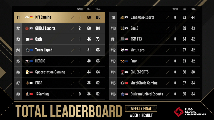 ... 이로써 KPI Gaming는 30,000 달러의 위클리 파이널 승리 상금과 그랜드 파이널 직행 티켓을 획득하게 됐다. 한국팀 GHIBLI Esports는 매치 1과 매치 7에서 치킨을 획득하며 KPI Gaming과 치열한 선두 경쟁을 펼쳤지만, 2일 차 후반부에서 점수를